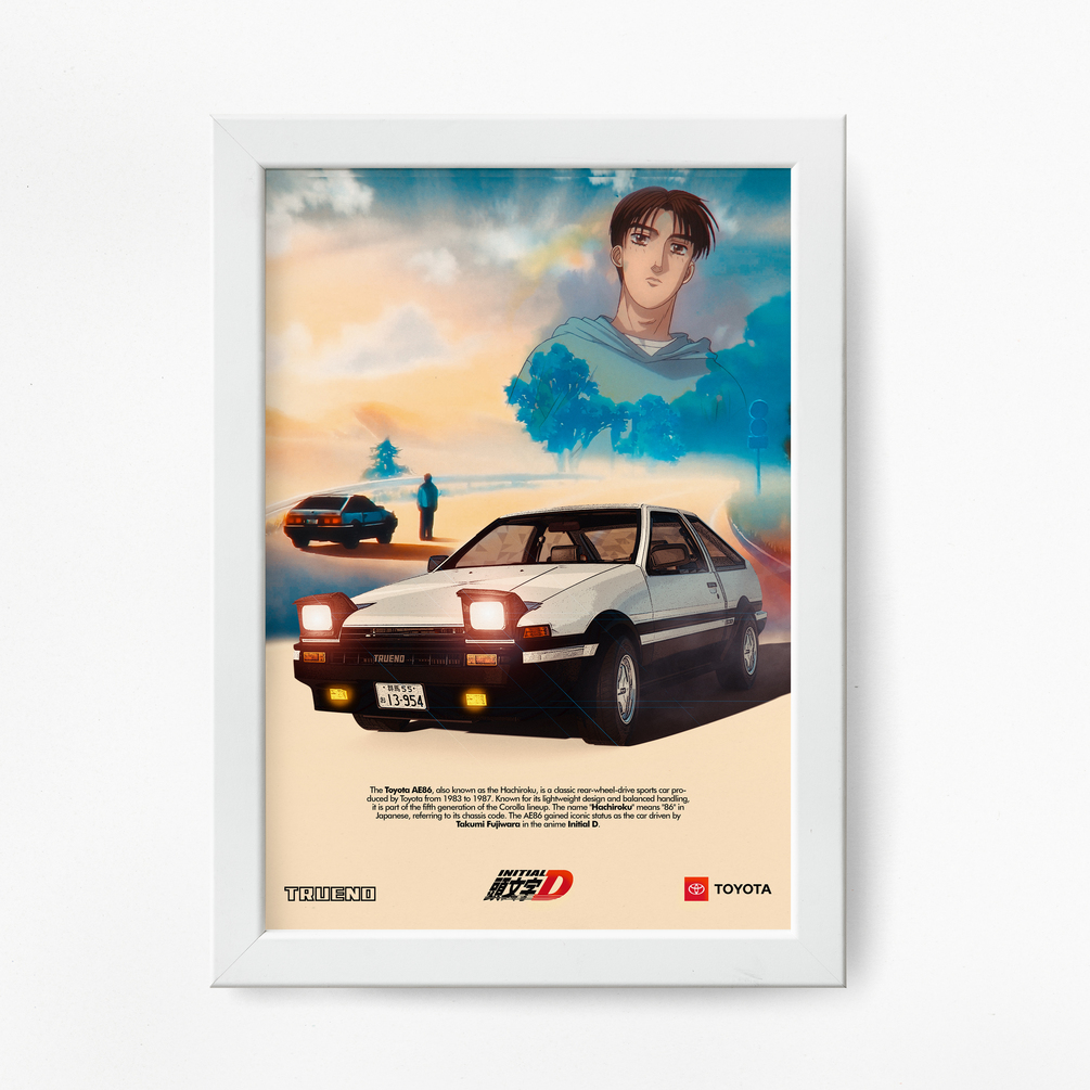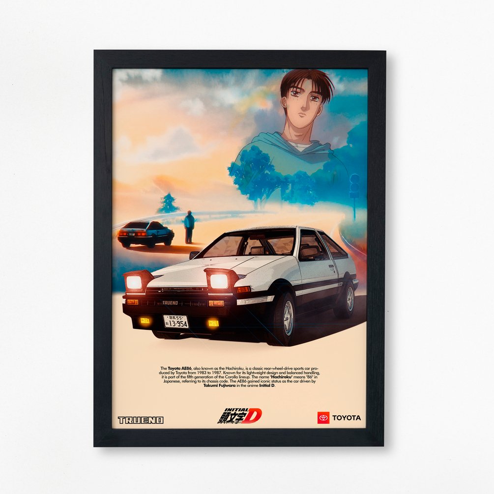 Celebrate the legendary Initial D with this autumn-themed canvas framed artwork featuring Takumi Fujiwara's iconic Toyota Trueno AE86, also known as the "Hachi-Roku." This piece captures the beauty of the season while highlighting the spirit of street racing, making it a perfect addition to any fan's collection.